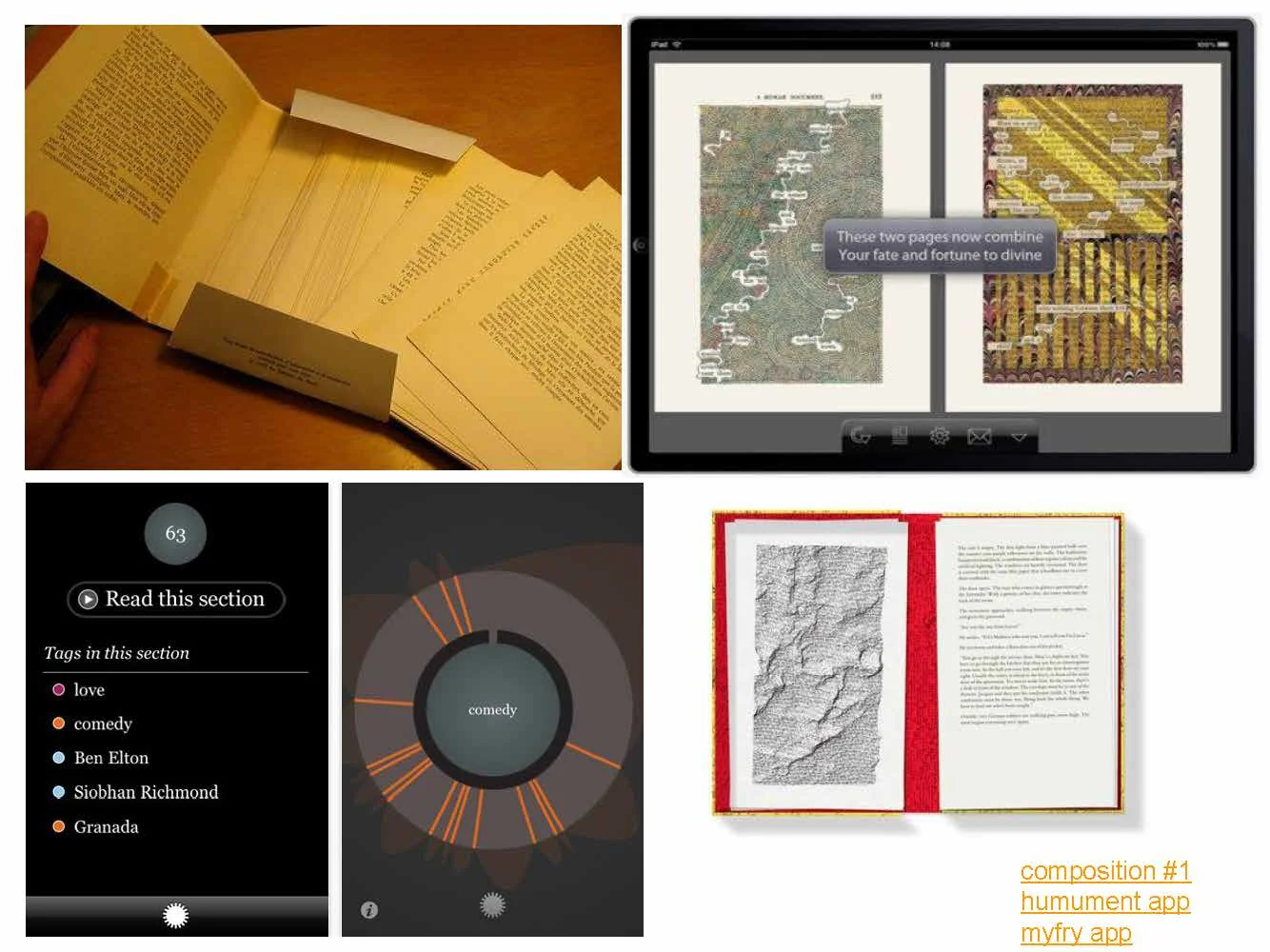 Tom Phillips’ amazing book The Hummument is a book that is made into a completely different book. I love the physical reproduction of the one-off book, I love the ipad version too, but is it a book? Or just picures of a book? ipad version Stephen Fry’s autobiography, MyFry, has a fantastic iPad edition developed by Penguin which lets you browse a snippet-based, tag-generated version.