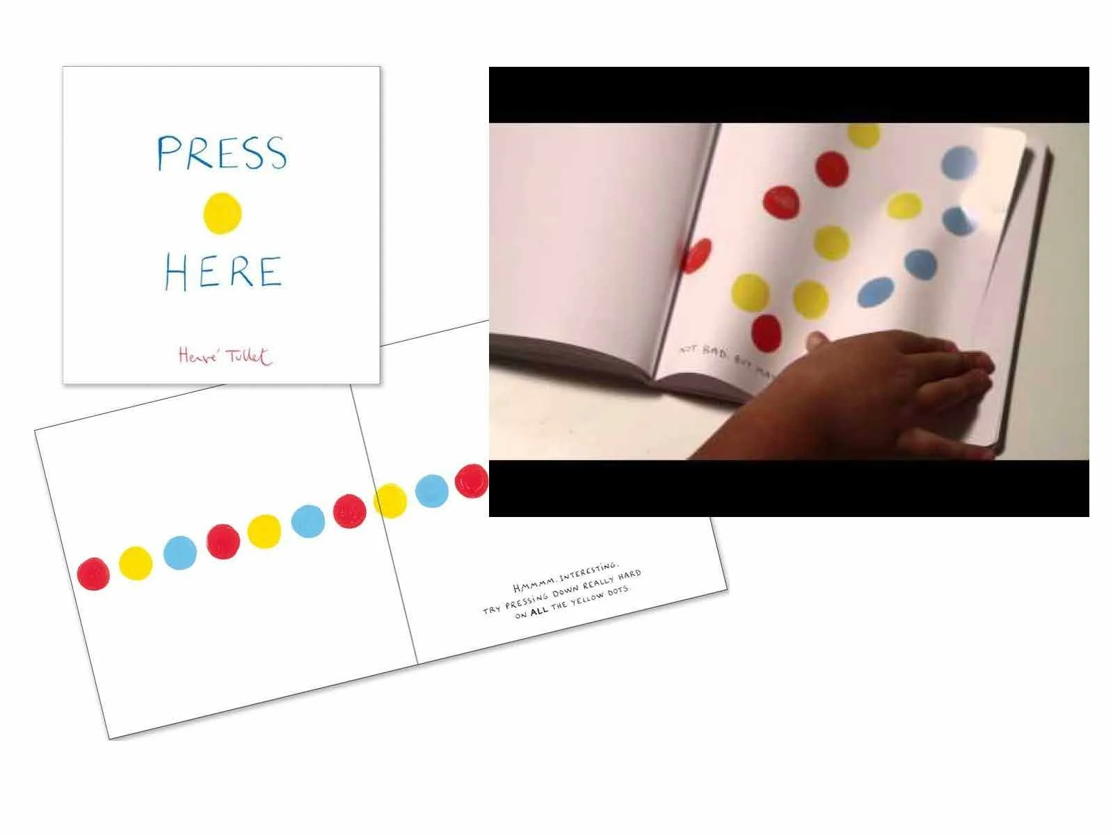 Press Here - Herve Tullet - creates new content based on newly intuitive interfaces. Taking the language of digital interactions and turning them into physical. And it’s completely charming.