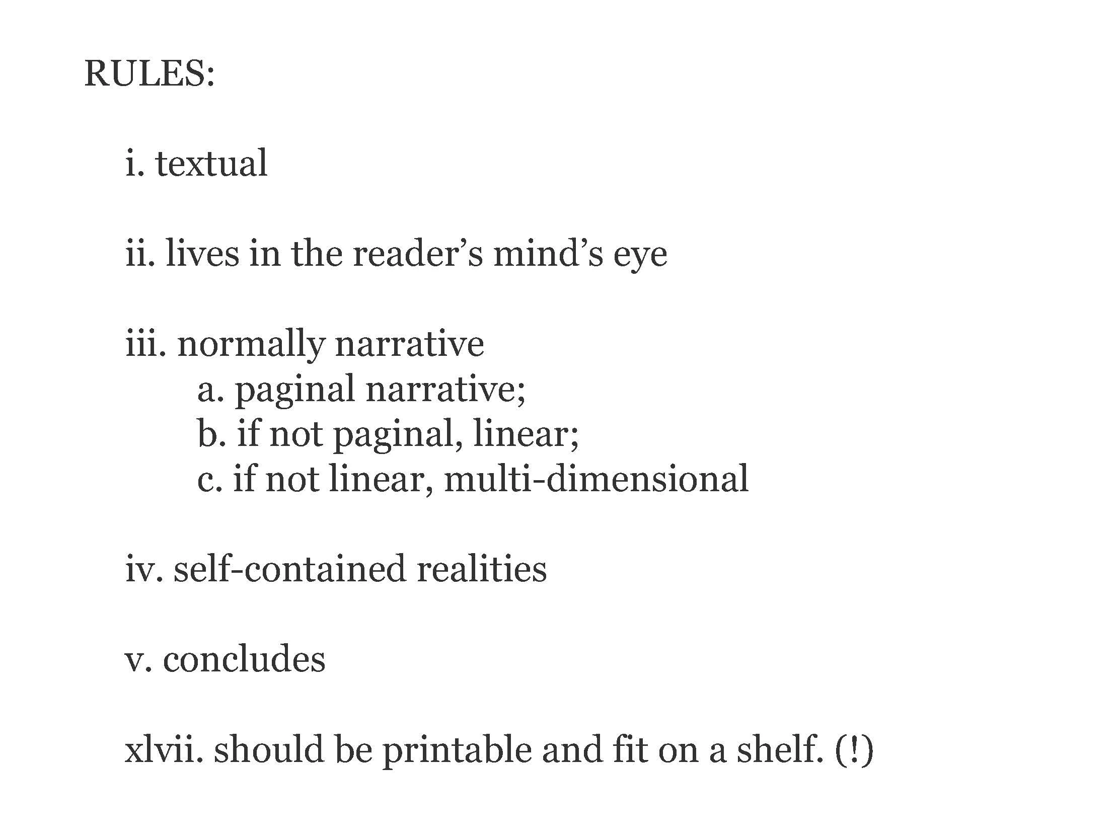 3. traditional this is a paginal narrative; or, if not paginal, linear; or, if not linear, multi-dimensional - a self-contained reality, a “world” of the authors imagination. See Tolkein, or Terry Pratchett, or Fantasy Gaming books; or AS Byatt, or Dickens, or any good author, or even a bad one.