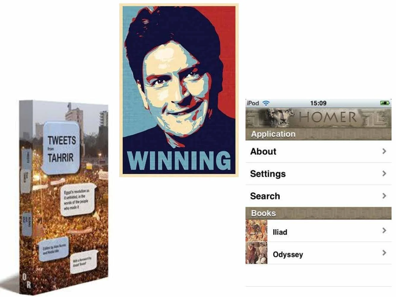 Charlie Sheen is an excellent example of this. If you could capture that explosion of narrative in a single form that could be a book. Instead we have the amazing Tales from Tahrir : which is a physical book composed entirely of tweets from Eygpt during the uprising there. This is a bubbling pot of potential: NYPL is trying to crowd source a book; Neal Stephenson’s Mongoliad crowdsources a community of authorship.