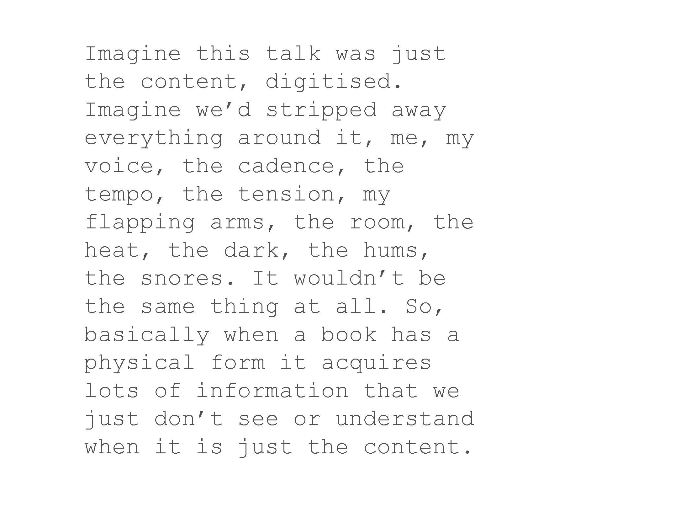 Imagine this talk was just the content, digitised. Imagine we’d stripped away everything around it, me, my voice, the cadence, the tempo, the tension, my flapping arms, the room, the heat, the dark, the hums, the snores. It wouldn’t be the same thing at all. So, basically when a book has a physical form it acquires lots of information that we just don’t see or understand when it is just the content.