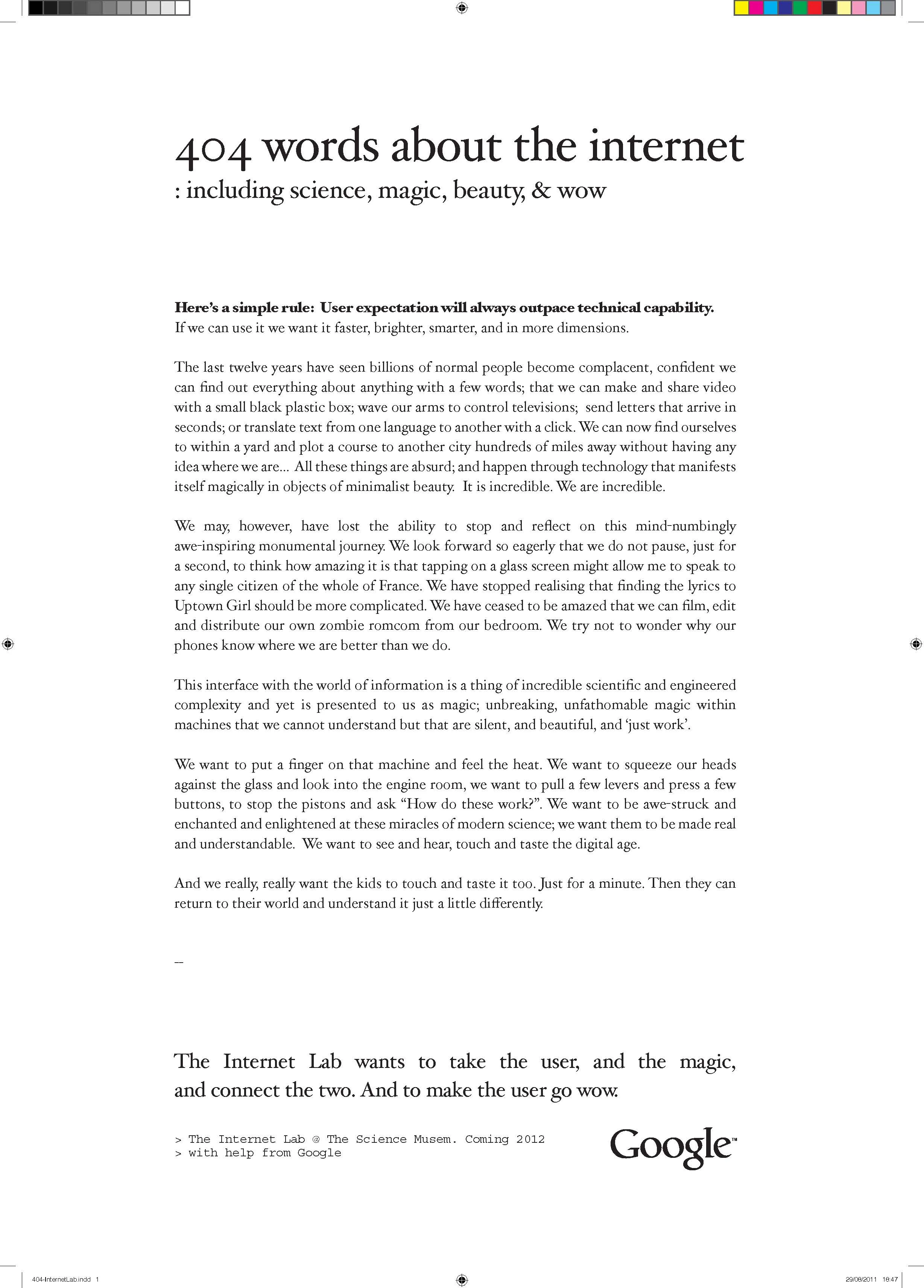 Eventually: It became an 'Interactive Museum Exhibition' for the Science Museum in London [with Tellart] called Web Lab. Mainly thanks to Tellart, Max Madile, Steve Vranakis and the London Creative Lab. I basically abdicated all responsibility which is why a) it did so well, and b) the video is so pretty.